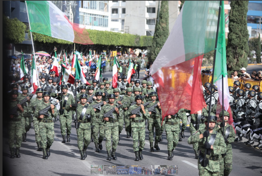 El paso de los contingentes comenzó con la participación de 14 oficiales del Ejército Mexicano, 733 de tropa con tres banderas monumentales y cinco estandartes, 79 conscriptos, 53 vehículos y cuatro binomios caninos.