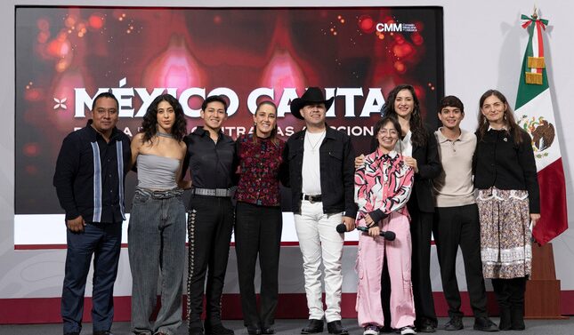 CDMX 10 Octubre 2025.- La Presidenta Claudia Sheinbaum Pardo anunció que, como parte de la iniciativa binacional “México Canta por la paz y contra las adicciones”, las y los ganadores y finalistas iniciarán una gira en la que realizarán conciertos, así como visitas a escuelas y centros de jóvenes para promover, a través de la nueva música mexicana, letras que no hagan apología a la violencia o al consumo de drogas.
