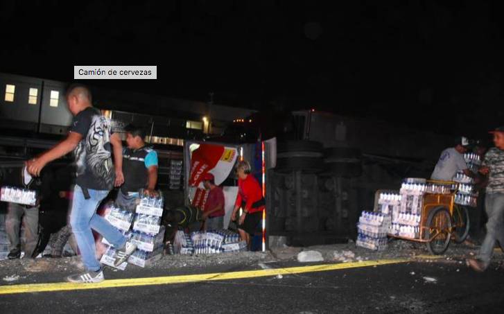 Elementos de la Guardia Nacional acudieron a auxiliar al operador, y poner orden, sin embargo al menos 50 personas armados de cubetas, mochilas, carretillas se llevaron decenas de cervezas.