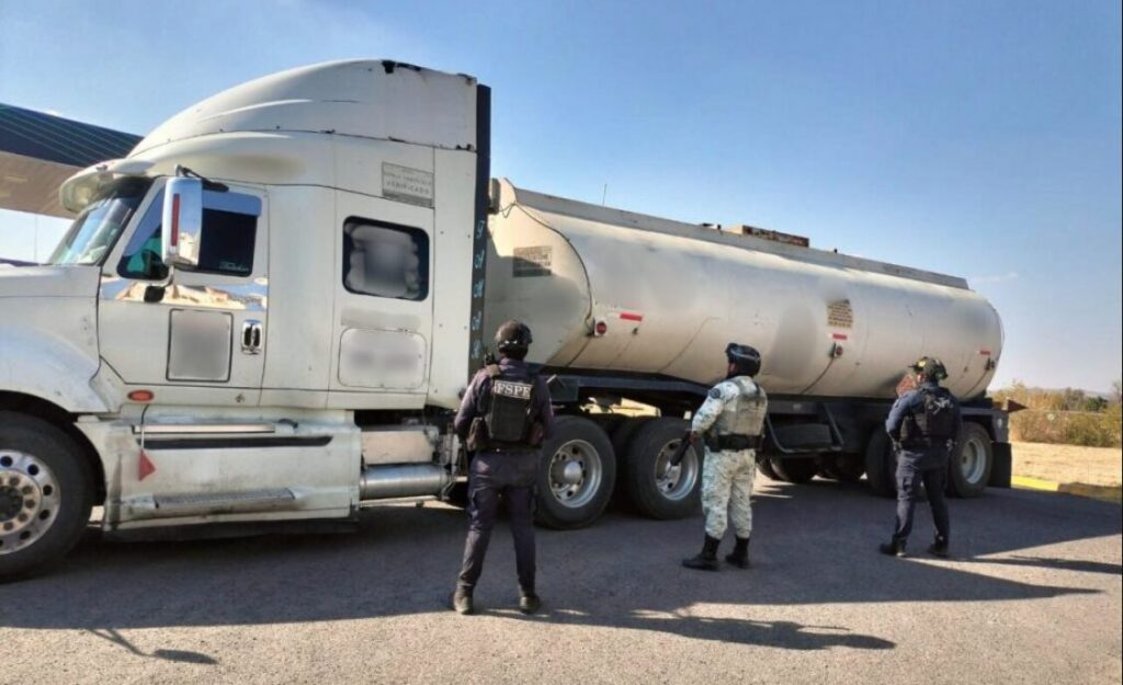 En el lugar, integrantes operativos detectaron un tractocamión con doble tanque que presentaba irregularidades visibles: ausencia de número de identificación vehicular en uno de los contenedores y sellos alterados.