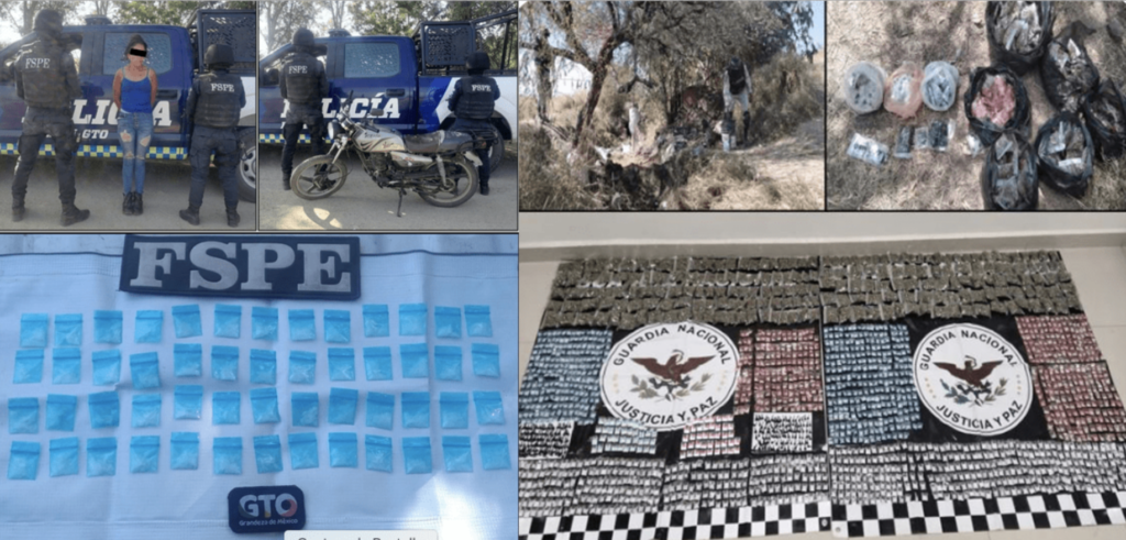 En el municipio de Irapuato, sobre el camino de San Miguel del Brete a la comunidad de Bernales, se aseguraron 3 mil 384 dosis de drogas sintéticas y 2 mil 300 de marihuana; y en la comunidad de los Conejos, se localizaron un arma hechiza, un cargador y 315 dosis de drogas sintéticas. También se realizó la detención de un masculino con 264 dosis de drogas sintéticas, en la colonia Hacienda La Virgen, se detuvo a un masculino con 5 armas de fuego, 4 cargadores, 8 granadas de fragmentación, 3 chalecos tácticos y una camioneta.