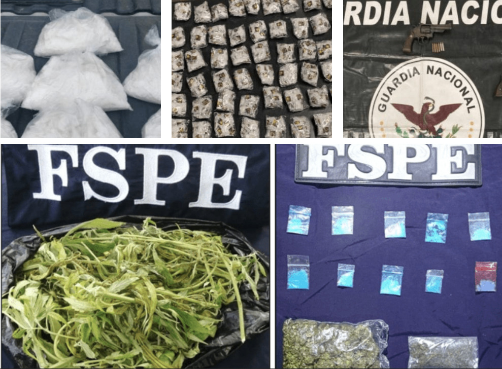 Entre las acciones realizadas, en el municipio de Irapuato, en la comunidad de Tomelopitos, fueron puestas a disposición dos personas a quienes se les localizaron 7 mil 645 dosis de drogas sintéticas; y en la comunidad La Soledad, se aseguraron 7 armas, 90 cartuchos de diferentes calibres y 50 dosis de drogas sintéticas.