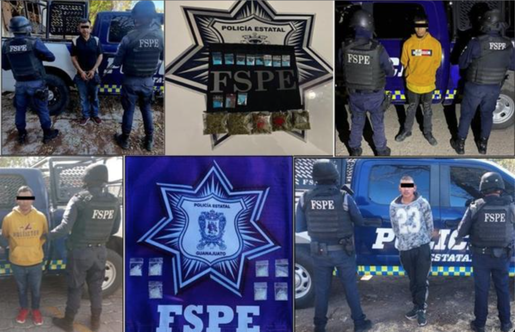 Durante un operativo en la colonia Barrio de la Salud, en Irapuato, se puso a disposición a un masculino con 63 dosis de drogas sintéticas a bordo de una motocicleta; y en el Zapote del Milagro, se detuvo a una persona con 541 dosis de marihuana y 54 de diversas drogas sintéticas.