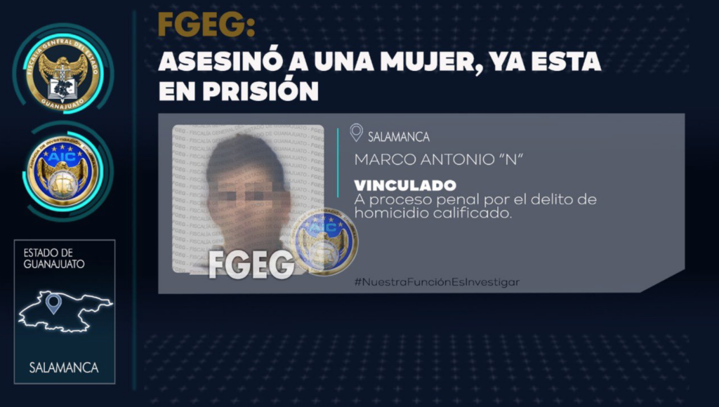 Salamanca, GTO. 16 Julio 2022.- Un hombre fue detenido por elementos de la Fiscalía General del Estado, acusado de asesinar a una mujer de 33 años.