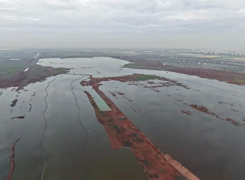 Texcoco, Méx. (10 julio 2025).- Integrantes del Frente de Pueblos en Defensa de la Tierra (FPDT) aseguraron que va a desaparecer “todo rastro que dejaron las obras de construcción del Nuevo Aeropuerto Internacional de México (NAIM), cuya estructura está quedando sumergida en los espejos de agua que resurgen en el Lago de Texcoco”.