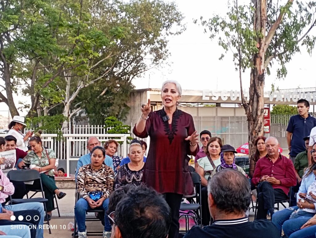 Frente a la Escuela Vanguardia la ex presidenta municipal prometió a unas 100 personas que de llegar a ser gobernadora traería recurso para muchas escuelas vanguardia, al resaltar una de las obras emblema de su administración.