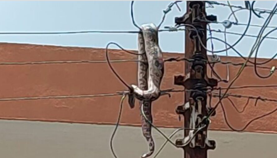 La serpiente cayó a los cables de alta tensión y le causó la muerte. El cuerpo del reptil quedó colgado en lo alto del poste.