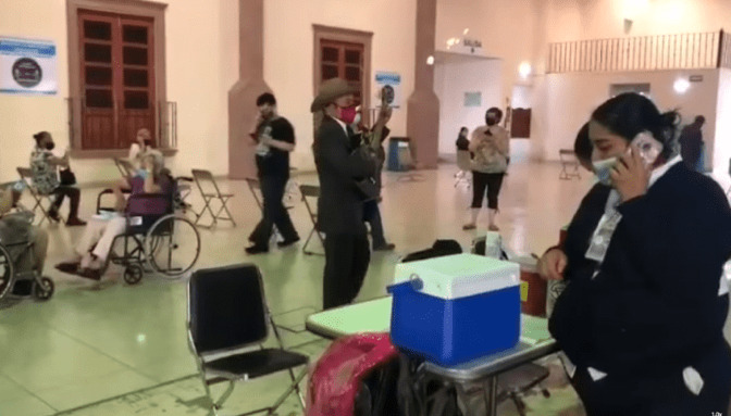 Un adulto mayor en Salamanca luego de recibir su vacuna contra el COVID-19 sacó su guitarra y se puso a cantar “Caminos de Michoacán” para agradecer al personal médico.