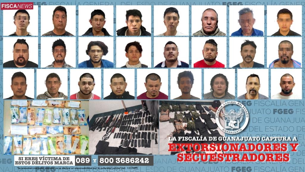 Guanajuato, Gto. (23 junio de 2023).- En Guanajuato fueron capturados 25 presuntos extorsionadores que cobraban derechos de piso. operaciones tácticas. La banda delictiva además se dedicaban al secuestro en los municipios de Celaya, Apaseo el Grande. Acámbaro, Irapuato, San Luis de la Paz, Apaseo el Alto, San Miguel de Allende, Cortázar, León y Juventino Rosas.