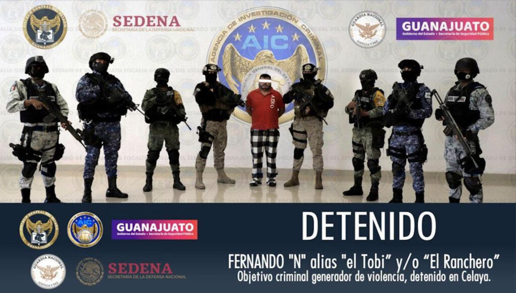 Guanajuato, Gto. 20 de mayo de 2021. FERNANDO “N”, apodado “El Tobi” y/o “El Ranchero”, objetivo criminal generador de violencia en el Estado de Guanajuato, ha sido capturado, derivado del trabajo de investigación especializado encabezado por la Agencia de Investigación Criminal de la Fiscalía General del Estado (FGE), en coordinación con el Ejército Mexicano, Guardia Nacional y la Secretaría de Seguridad Pública del Estado (SSPE).