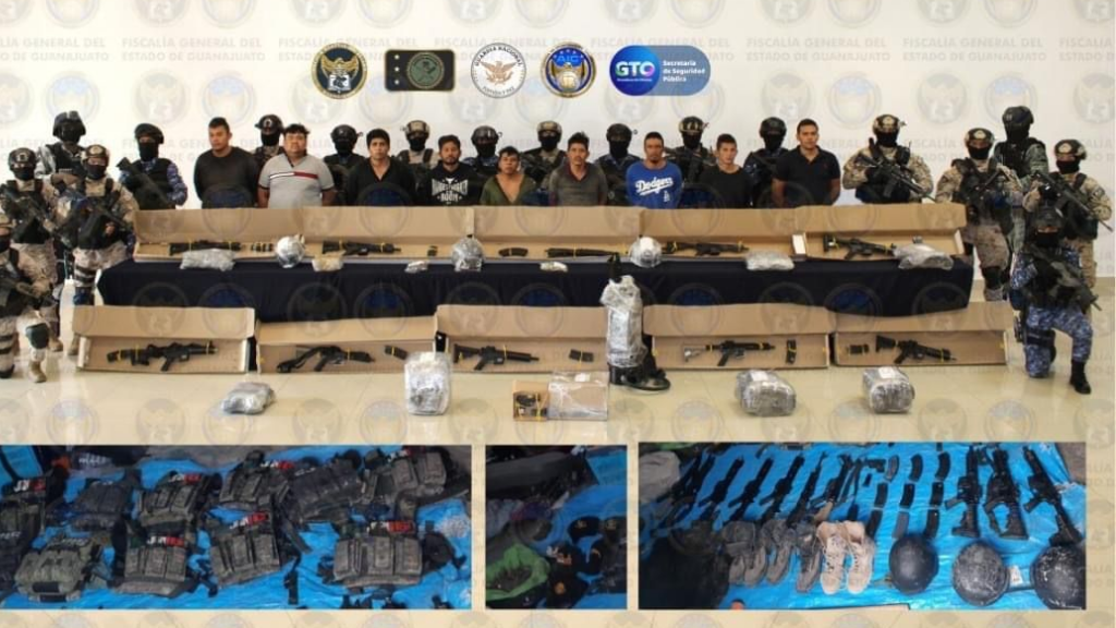A excepción de los que fueron ubicados al exterior del inmueble, señalados como vigilantes, el resto de los detenidos fueron sorprendidos al interior con las armas de fuego empuñadas y portaban chalecos balísticos con las siglas de una organización criminal.