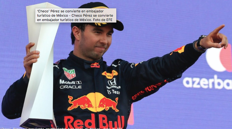 Ciudad de México (23 junio 2021).- Sergio ‘Checo’ Pérez, piloto de Fórmula Uno, aceptó con emoción su designación como embajador de destinos turísticos de México tras una alianza entre su escudería, Red Bull, con la Secretaría de Turismo.