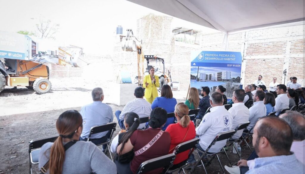 León, Guanajuato, 16 abril 2025.- La Presidenta Municipal, Alejandra Gutiérrez Campos colocó la primera piedra del desarrollo Hábitat 23 y 7 en la zona Río Mayo, Avanza León, para que 30 familias tengan el derecho de un patrimonio que brindará certeza jurídica y ayudará a mejorar su calidad de vida.