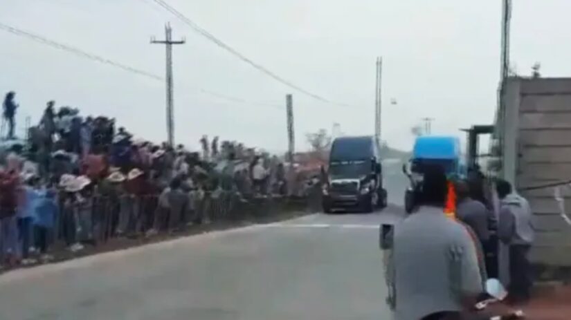 En un video que circula en redes sociales, se puede observar el momento de la carrera en la que van dos tractocamiones a toda velocidad y el tráiler de color azul choca con una barda y arrolla a los asistentes.