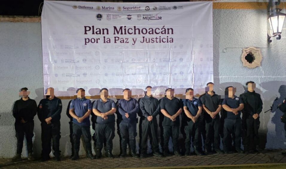 Morelia, Michoacán.– En un operativo conjunto encabezado por la Secretaría de Seguridad Pública (SSP) de Michoacán y la Guardia Civil, se logró la detención de 11 elementos de la Policía Municipal de Ecuandureo, incluido el director de la corporación, Jorge Andrés Valencia Sánchez, acusados de colaborar directamente con el Cártel Jalisco Nueva Generación (CJNG).
