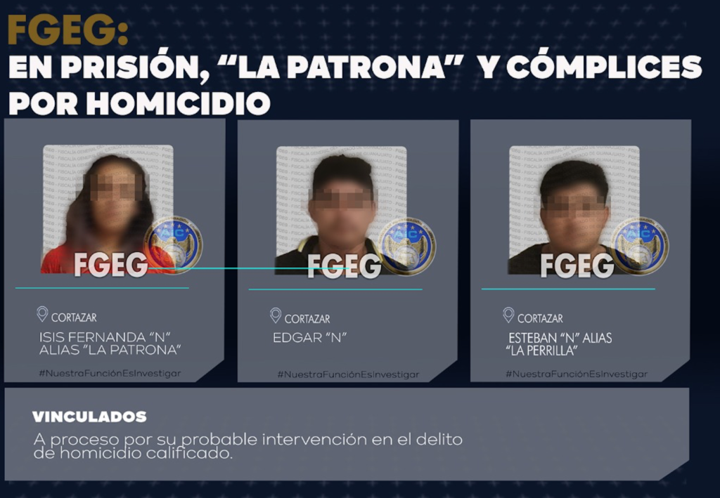 Cortazar, Gto 2 Junio 2022.- Isis Fernanda «N» alias “La Patrona” y sus cómplices ejecutaron a un hombre que les debía dinero por supuesta compra de enervantes, en la zona centro de esta ciudad. Los agresores fueron identificados gracias a las pistas y pruebas materiales localizadas en la escena del crimen, ya se encuentran en la cárcel, vinculados a proceso penal.
