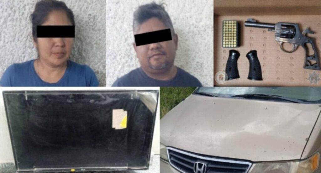 Durante la revisión, los oficiales encontraron un revólver con una caja de cartuchos, además de una pantalla, presuntamente robada.