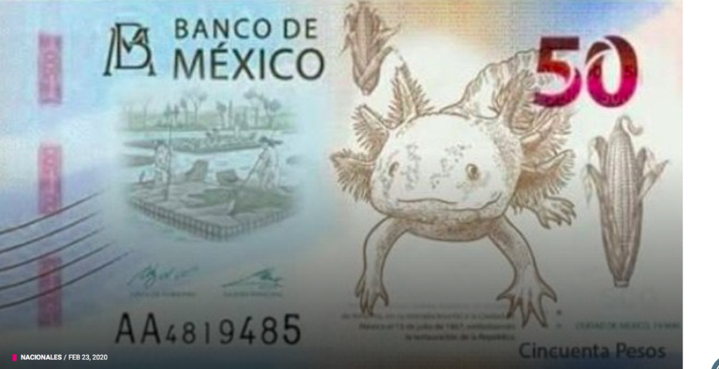 Para empezar, el billete de 50 pesos tendrá una imagen de la fundación de México. Y por el reverso al místico ajolote y al maíz.
