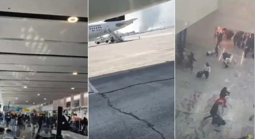 El pánico generó que hubiera personas resguardadas sobre las bandas de equipaje en el área de documentación; adultos mayores, jóvenes y familias completas permanecen agachados o sentados en el suelo. En distintos puntos se observa a usuarios buscando protección detrás de mostradores y mobiliario.