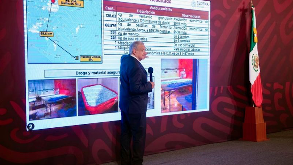 Añadió que tampoco es el caso de Sinaloa, donde han encontrado laboratorios y aprovechó para informar que localizaron el segundo laboratorio más grande durante su administración, lo que significó una pérdida para quienes se dedican al tráfico de drogas de mil 500 millones de pesos.