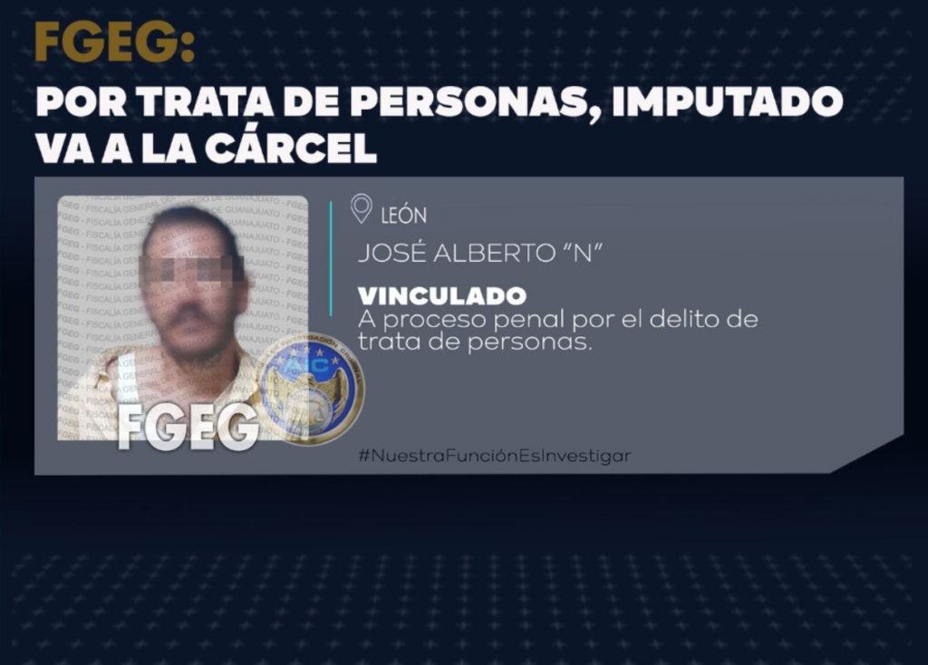 León, GTO 6 Agosto 2022.- Un sujeto fue detenido en León por elementos de la Fiscalía General del Estado, acusado de explotar sexualmente a una víctima, a quien promocionaba en internet y la comercializaba para obtener pago de ello. Se encuentra bajo proceso penal y en prisión preventiva por el delito de trata de personas.