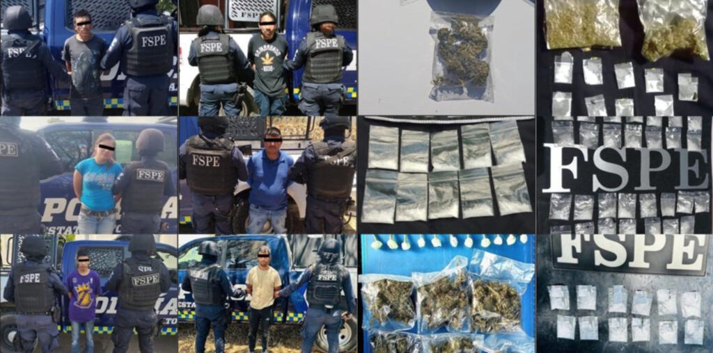En la colonia San Luis Rey, en San Miguel de Allende, se puso a disposición a un masculino con 30 dosis de drogas sintéticas; en Urireo, del municipio de Salvatierra, se localizaron 6 envoltorios con drogas sintéticas y un arma de fuego; y se aseguraron 40 bolsas de plástico transparentes con drogas sintéticas en la colonia Libertad en Dolores Hidalgo.
