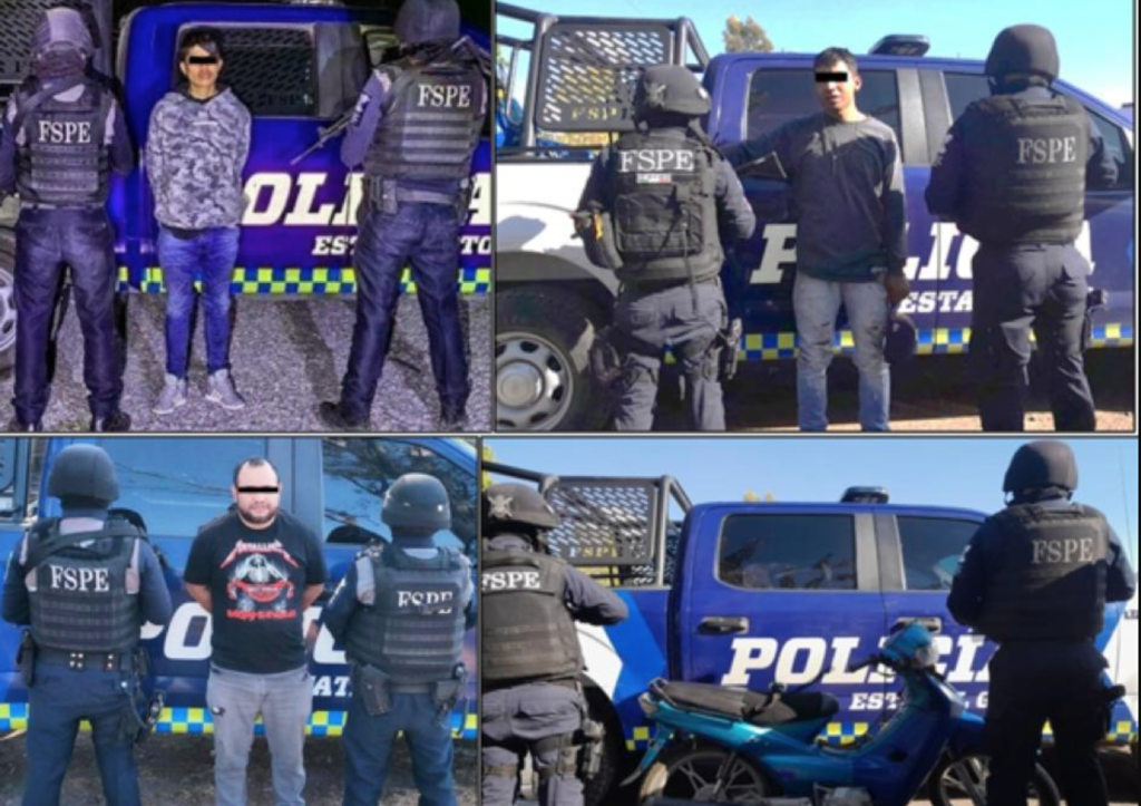 También en Irapuato y derivado de operativos dirigidos a la desarticulación de células delictivas, en la colonia Niños Héroes, se detuvo a 4 masculinos y una femenina con 6 armas de fuego, 232 cartuchos útiles, 19 cargadores, 6 chalecos balísticos, 29 artefactos explosivos, 2 vehículos, 38 artefactos ponchallantas, ropa táctica, y un dron; los detenidos refieren pertenecer a una célula delictiva, responsables de homicidios y eventos de alto impacto en la zona.