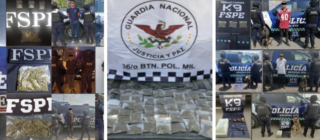 En Irapuato, en la colonia Las Brisas, se realizó la detención de un masculino con 23 dosis de marihuana; en Bajada de San Martín, se detuvo a una persona con un arma de fuego, 5 cartuchos, 21 dosis de drogas sintéticas y una motocicleta; también se aseguraron 187 dosis de drogas sintéticas en la colonia Villas de San Miguel en San Francisco del Rincón; y en la comunidad de San José de Mendoza, en Salamanca, se aseguraron 4 camionetas y un vehículo sedán, todos con reporte de robo.