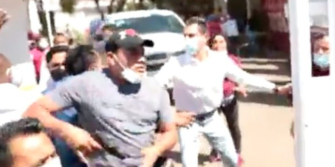 Escoltas de la delegada de Bienestar en Oaxaca, Nancy Ortiz, encañonaron al presidente municipal de Santa Lucía del Camino, Dante Montaño Montero, quien protestaba junto a un grupo de personas por la falta de vacunas contra COVID-19.