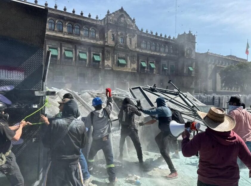 Hacia las tres de la tarde, prácticamente la totalidad de las vallas que resguardaban el frente de Palacio Nacional habían sido derribadas. Para calmar los actos de violencia, los policías se replegaron un poco y formaron un bloque con sus escudos. No obstante, jóvenes con el rostro cubierto siguen arrancando las vallas.