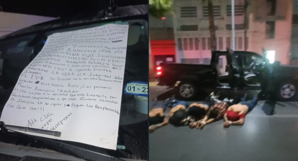 Tamaulipas 09 Marzo 2023.- Cinco personas maniatadas y bocabajo fueron “entregadas” por el Cártel del Golfo a las autoridades al lado de una camioneta en calles del centro de Matamoros, Tamaulipas, junto a una cartulina que los señaló como responsables del secuestro de cuatro ciudadanos estadounidenses y el asesinato de dos de ellos el pasado 3 de marzo.