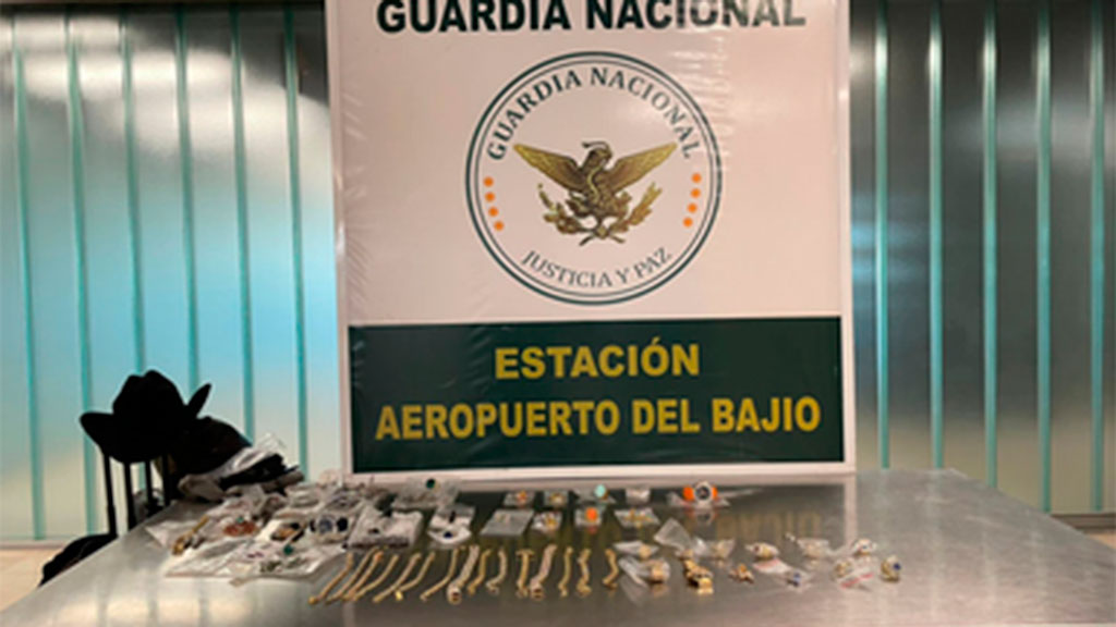 Elementos de la Guardia Nacional y personal de la Agencia Nacional de Aduanas de México (ANAM), pudieron detectar las 80 piezas de joyería en su llegada al Aeropuerto del Bajío.