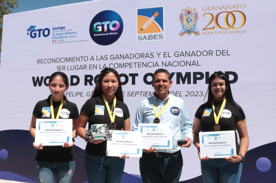 Durante el acto protocolario, acompañaron al Director General del SABES, el Lic. Rogelio Carrillo Guerrero, Director para la Formación Integral en Educación Media Superior, en representación del Mtro. Jorge Enrique Hernández Meza, Secretario de Educación de Guanajuato; la Mtra. Lirio López Herrera, Directora del Bachillerato SABES; Dulce Ivonne Ríos González, representante de las alumnas reconocidas y el Ing. Juan Manuel Amaro Guevara, jefe de centro y coach del equipo de robótica “Rocket”.