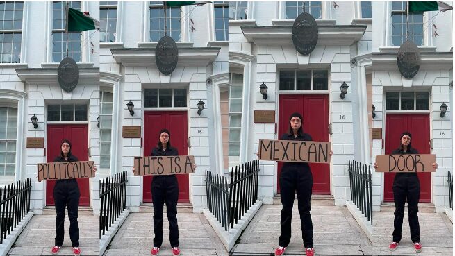 La Plataforma por la Paz a su vez recompartió la publicación en la que Sara Pinedo dice en inglés «Políticamente esta es una puerta mexicana», en la entrada a la Embajada de México en Reino Unido.