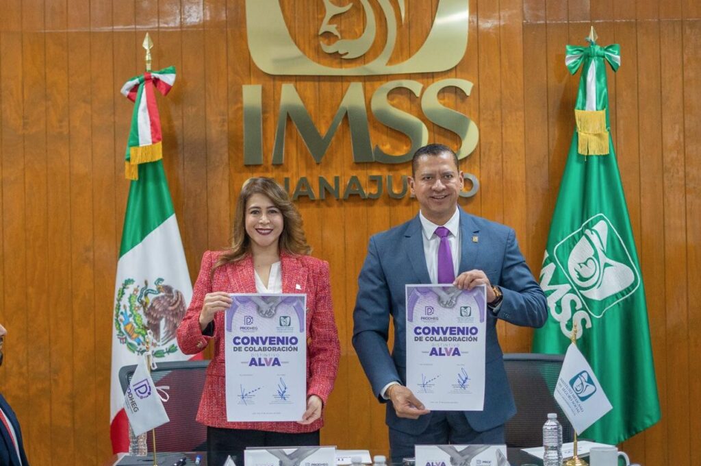 León, GTO 22 Octubre 2025.- La delegación Guanajuato del Instituto Mexicano del Seguro Social (IMSS) y la Procuraduría de los Derechos Humanos del Estado de Guanajuato (PRODHEG) firmaron el Convenio de Colaboración Distintivo Alianza contra la Violencia (ALVA) para el fortalecimiento de las acciones dentro del Instituto para la atención a mujeres víctimas de la violencia.
