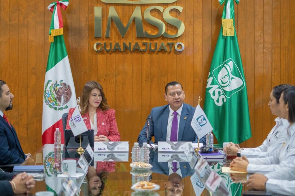 León, GTO 22 Octubre 2025.- La delegación Guanajuato del Instituto Mexicano del Seguro Social (IMSS) y la Procuraduría de los Derechos Humanos del Estado de Guanajuato (PRODHEG) firmaron el Convenio de Colaboración Distintivo Alianza contra la Violencia (ALVA) para el fortalecimiento de las acciones dentro del Instituto para la atención a mujeres víctimas de la violencia.