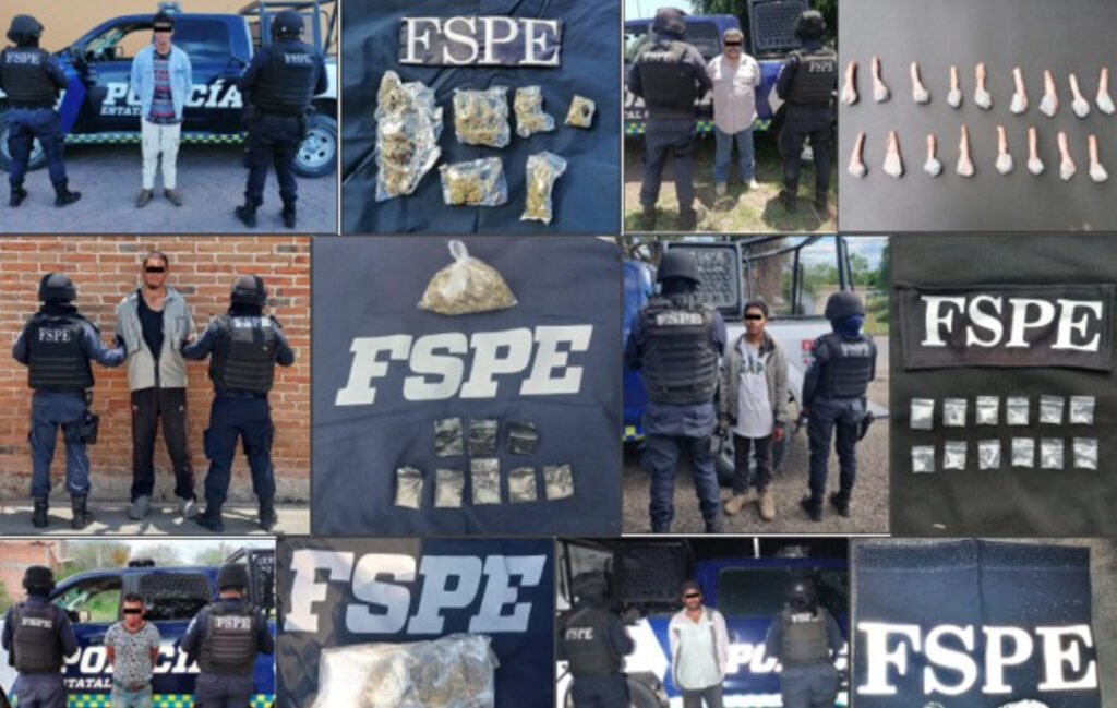 Guanajuato, Gto., 31 de agosto de 2023.- Elementos de las Fuerzas de Seguridad Pública del Estado (FSPE) lograron asegurar durante patrullajes implementados en varios municipios de la entidad, más de 200 dosis de la droga con las características del cristal y la mariguana. Dentro de estas acciones fueron detenidas siete personas.
