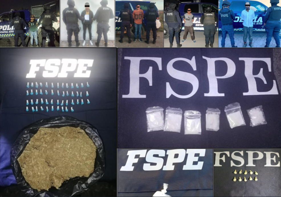 Guanajuato, Gto., 01 de noviembre de 2023.- Elementos de las Fuerzas de Seguridad Pública del Estado (FSPE) lograron asegurar en diversos municipios de la entidad, un total de 654 dosis de droga con las características del cristal y la mariguana.