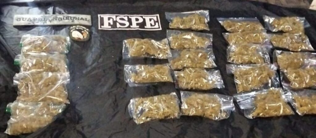 El personal operativo detectó a un individuo que adoptó una conducta evasiva al notar la presencia policial y en la inspección preventiva, se localizaron 25 bolsas con hierba verde y seca con características de marihuana, ocultas debajo de su chamarra en una bolsa de plástico color negro.