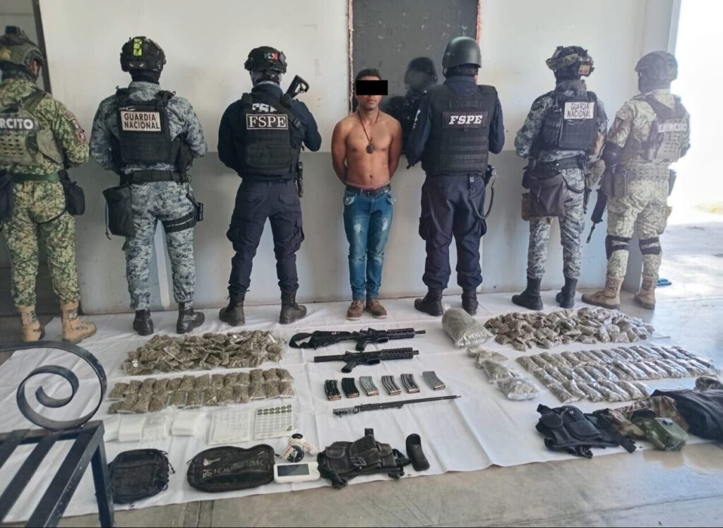 Durante la revisión se localizaron dos armas largas, cargadores y cartuchos de distintos calibres, equipo táctico y 7.9 kilogramos de marihuana, equivalente a 7 mil 970 dosis.