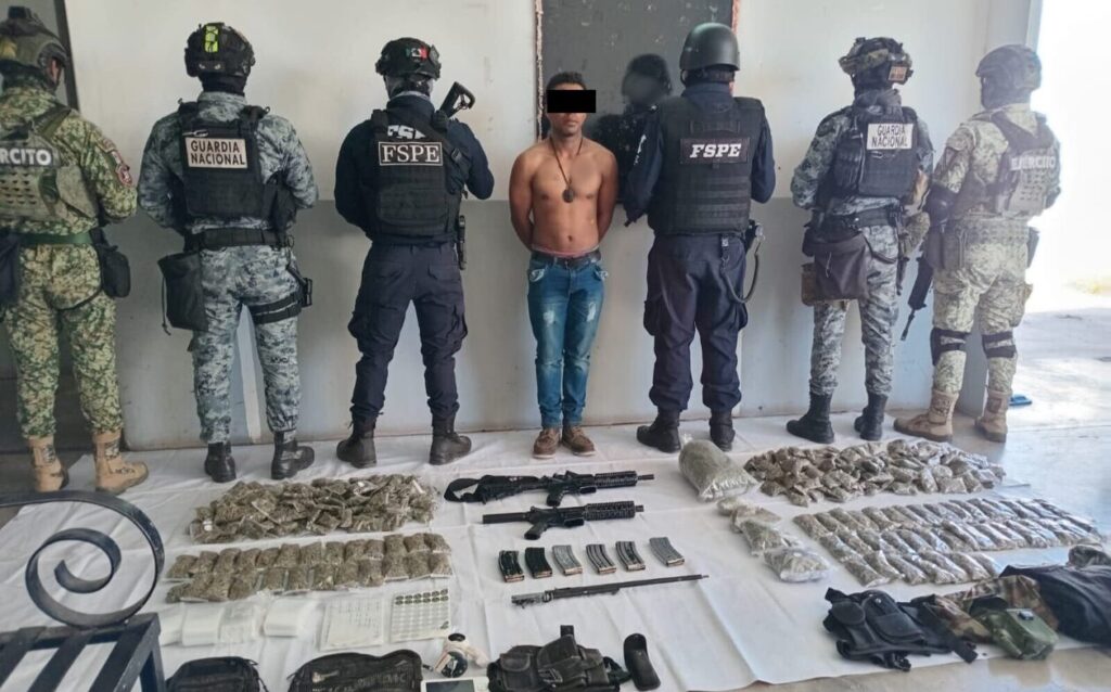 Durante la revisión se localizaron dos armas largas, cargadores y cartuchos de distintos calibres, equipo táctico y 7.9 kilogramos de marihuana, equivalente a 7 mil 970 dosis.