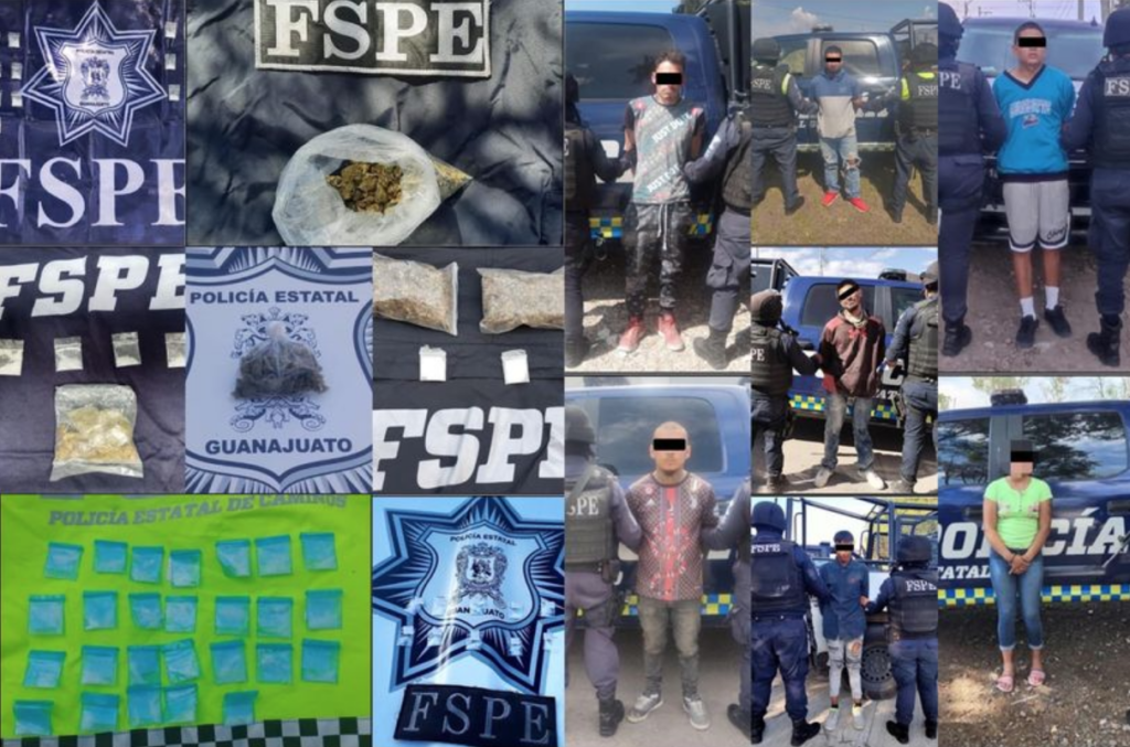 Guanajuato, Gto., 25 de julio de 2022.- Derivado de los patrullaje implementados en el estado, efectivos de las Fuerzas de Seguridad Pública del Estado (FSPE) lograron asegurar en diversos municipios de la entidad, un total de 150 dosis de cristal y mariguana. Dentro de estas acciones fueron detenidas siete personas.