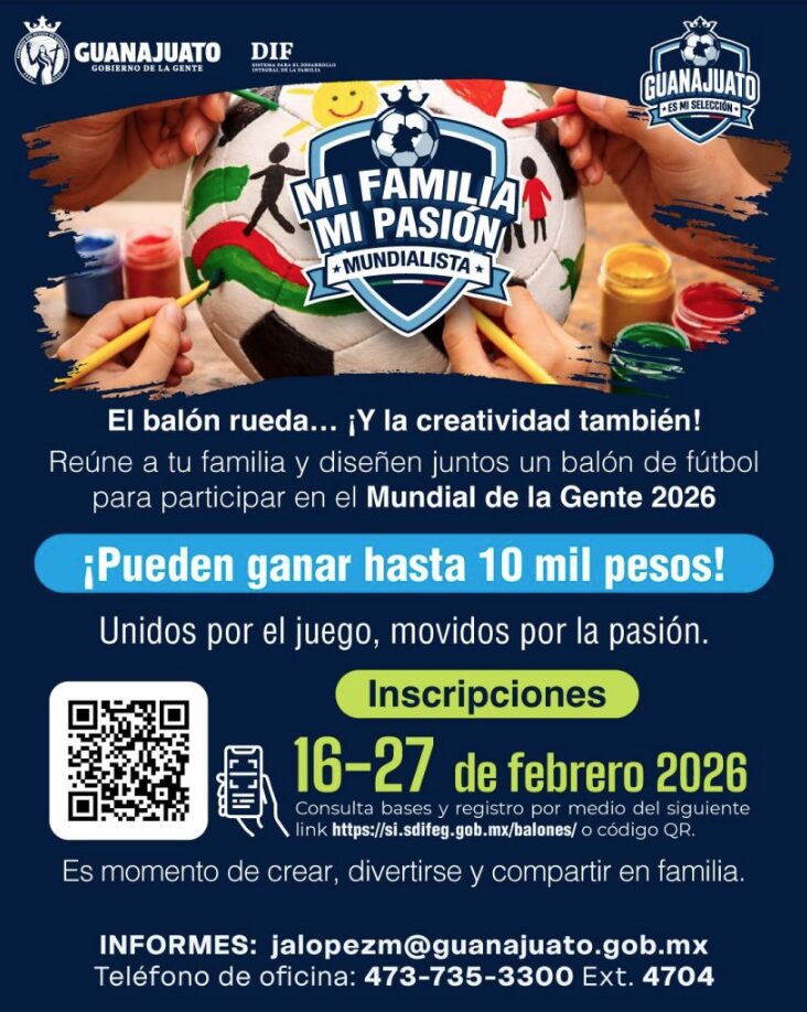 Guanajuato, Gto., 24 Febrero 2026.- La cuenta regresiva comenzó. Faltan pocos días para que cierre la convocatoria del concurso familiar de decoración de balones de fútbol Mi familia, mi pasión mundialista, y las familias de Guanajuato aún están a tiempo de sumarse a esta iniciativa que celebra el talento, la convivencia y los valores que se construyen en casa.