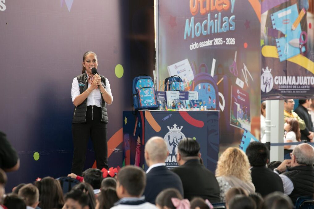 Moroleón, Gto. 15 de agosto de 2025.- “En Guanajuato queremos que nuestras niñas y niños estén en las aulas, que sigan estudiando. Hoy los quiero invitar, papás, mamas, a que hagamos equipo por la educación de nuestras hijas e hijos”, expresó la Gobernadora de la Gente, Libia Dennise García Muñoz Ledo, al entregar mochilas y útiles escolares para el Ciclo Escolar 2025-2026.