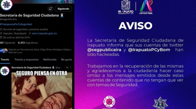 Al rededor de los 5:20 de la tarde los funcionarios municipales de seguridad confirmó que las cuentas (@segpublicaira, @irapuatoPCyBOM) confirmaron que habían hackeado las cuentas.