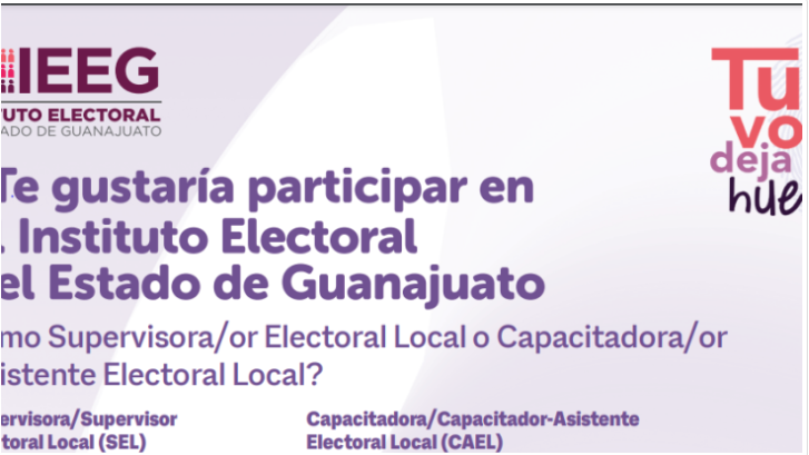 Guanajuato, Gto. (20 marzo 2024).- El Instituto Electoral del Estado de Guanajuato (IEEG), busca supervisores y capacitadores electorales para los procesos electorales 2024.