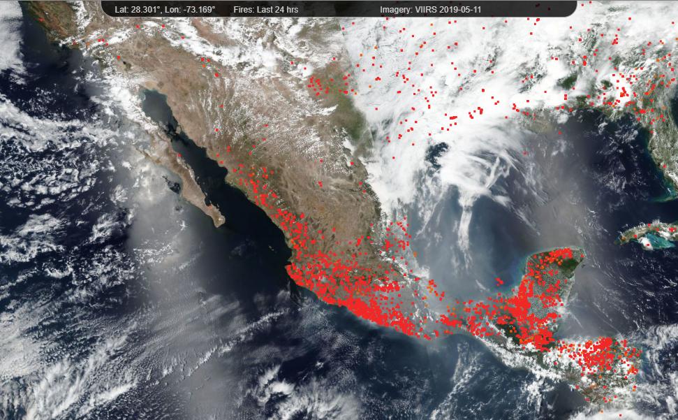 Imagen de satélite de la NASA de las zonas de incendios forestales en México en las últimas 24 horas.