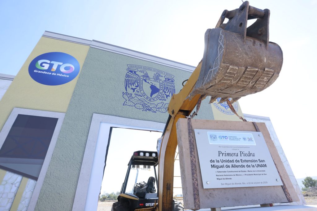 San Miguel de Allende; Gto. 22 de octubre de 2020.- Guanajuato, Con la colocación de la primera piedra de la construcción del plan maestro de la Unidad de Extensión de la Universidad Nacional Autónoma de México -UNAM- en San Miguel Allende, le da buenas noticias a México, dijo el Gobernador, Diego Sinhue Rodríguez Vallejo.