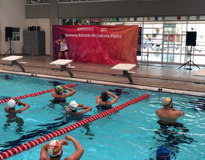 Las actividades iniciaron en el Centro Acuático de Dolores Hidalgo, donde se reunieron usuarios del Complejo Deportivo para realizar la parte que les corresponde activándose con clases de aqua zumba.