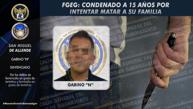 San Miguel de Allende, Gto. 9 febrero de 2022.- Sentencia la Fiscalía General del Estado de Guanajuato a 15 años de prisión a Gabino «N» declarado responsable de los delitos de feminicidio y homicidio en grado de tentativa.